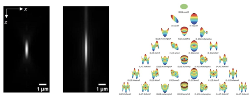 Left, simulated point-spread function (PSF) with and without extended DoF. Right, Zernike polynomials that can be applied to a deformable mirror (DM).