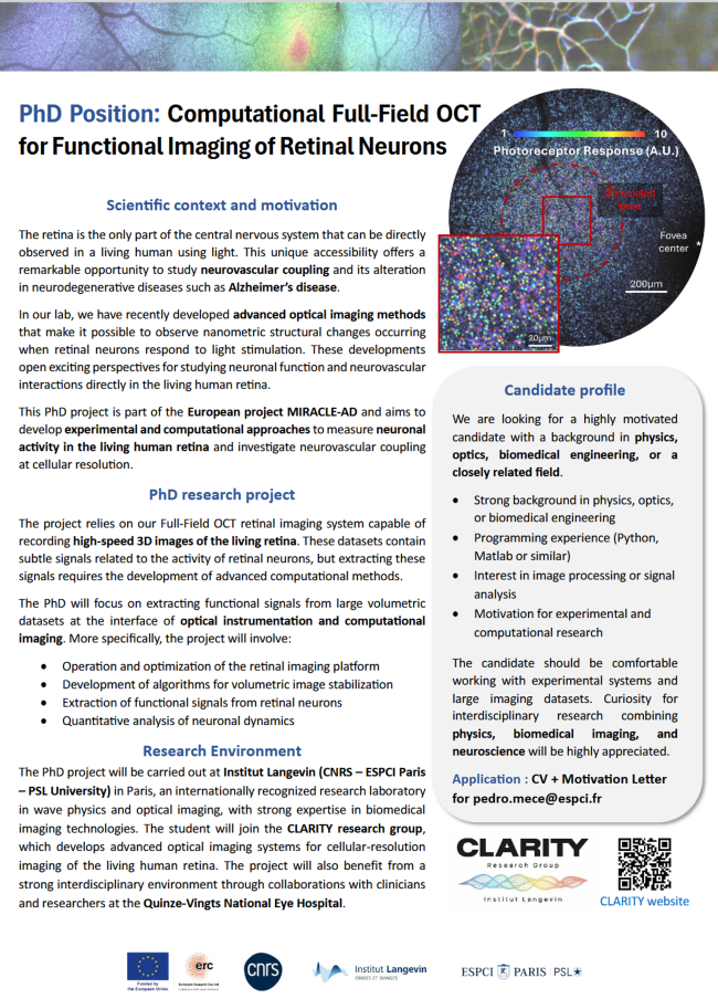 The PhD project will be carried out at Institut Langevin (CNRS – ESPCI Paris – PSL University) in Paris, an internationally recognized research laboratory in wave physics and optical imaging, with strong expertise in biomedical imaging technologies. The student will join the CLARITY research group, which develops advanced optical imaging systems for cellular-resolution imaging of the living human retina. The project will also benefit from a strong interdisciplinary environment through collaborations with clinicians and researchers at the Quinze-Vingts National Eye Hospital.