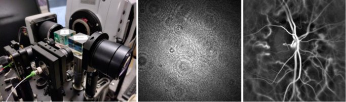Figure : Configuration d’imagerie Doppler holographique clinique (à gauche), motif d’interférence enregistré (au centre), image de la rétine humaine (à droite) reconstruite numériquement à partir des motifs d’interférence.