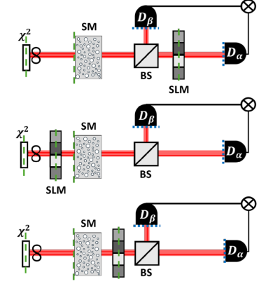 Dans ce travail, des chercheurs de l’Université Hébraïque de Jérusalem et de l’Institut Langevin comparent différentes manières de placer et d’utiliser un modulateur spatial de lumière – en façonnant un ou deux photons, avant ou après le milieu diffusant – et montrent quels montages reproduisent les performances classiques et lesquels les surpassent. Dans certaines géométries quantiques, focaliser des photons intriqués devient intrinsèquement plus difficile ; dans d’autres, cela permet au contraire de dépasser toute stratégie classique, ouvrant la voie à de nouvelles approches pour l’imagerie quantique et la communication sécurisée à travers des milieux complexes.